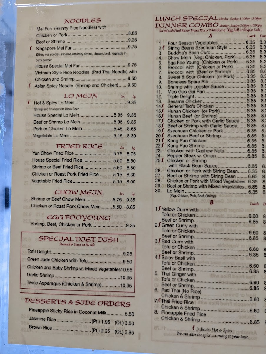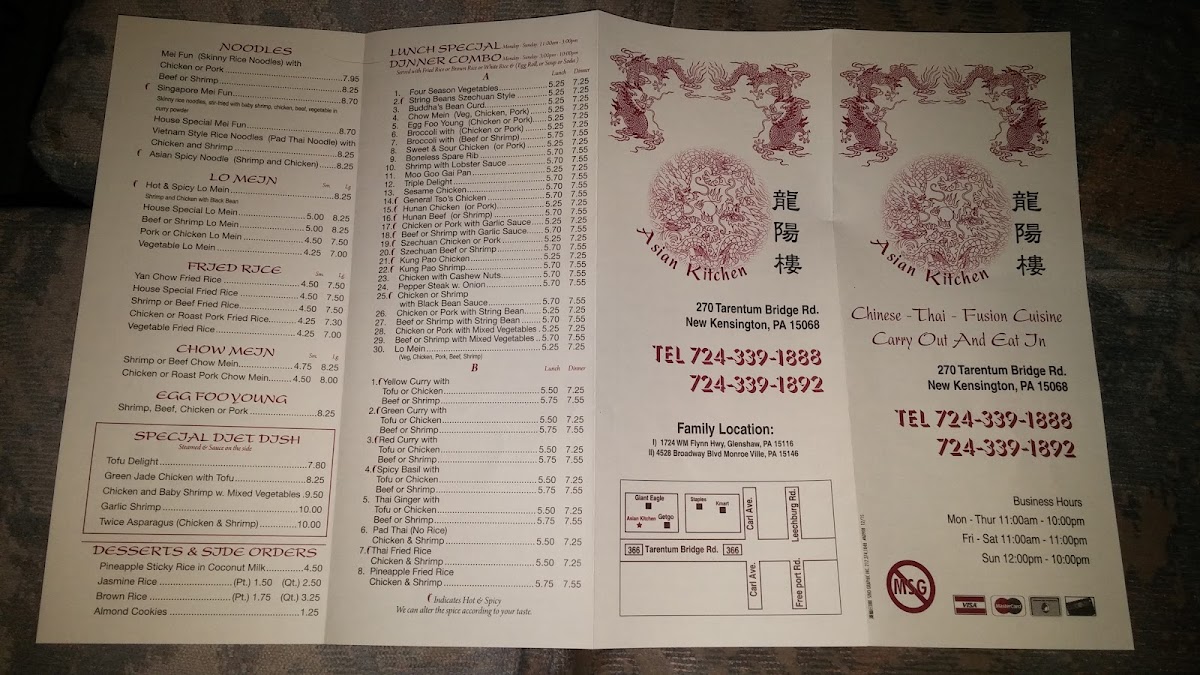 Welcome to Asian Kitchen, a gem nestled in New Kensington, PA, known for its authentic Chinese cuisine and swift service. At this bustling eatery, diners are greeted with an array of mouthwatering options, from Hong Kong Style Noodle Soup to a delightful selection of seafood dishes like the Crispy Honey Shrimp and Kung Pao Shrimp. The menu also features comforting classic favorites, including Sweet & Sour Chicken and Tofu dishes that have garnered admiration from local patrons. Customers rave about the freshness and generous portions, with many noting how quickly meals are prepared without compromising quality. Despite limited seating, Asian Kitchen's takeout thrives, making it a go-to for those seeking hearty, affordable meals. Whether you're craving delectable stir-fries or flavorful noodle soups, Asian Kitchen is ready to satisfy your culinary adventures!